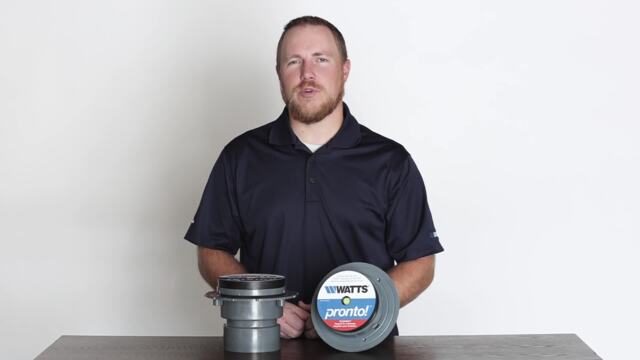 Watts Pronto! (R) CO-190-PR-60 PVC floor cleanout with anchor flange, post-pour adjustable round heel proof nickel bronze cover with integrated bubble level, leveling shims, and PVC socket outlet (standard).