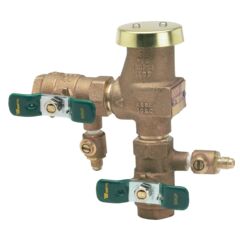Series 800M4FR Freeze Resistant Pressure Vacuum Breakers prevent the reverse flow of polluted water from entering into the potable water supply due to backsiphonage. They have a bronze body construction, silicone rubber check valve disc, plastic check valve seat, stainless steel springs, a bonnet with silicone rubber O-ring seal, a lightweight plastic disc float, a built-in relief valve to protect the internal components and the body from freezing, tee handle or lever handle shutoffs, and test cocks for winterization draining. Series 800M4FR is ideal in continuous pressure health hazard applications where exposure to sudden freezing conditions such as on irrigation systems and industrial process water systems can occur. Maximum Pressure: 150psi (10.3 bar), Minimum Pressure: 15psi (55kPa).