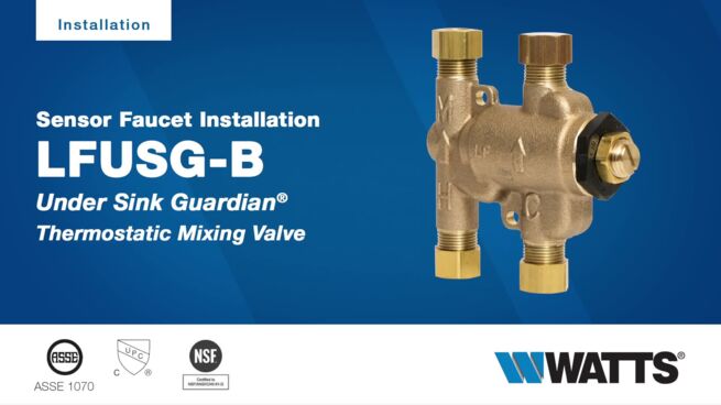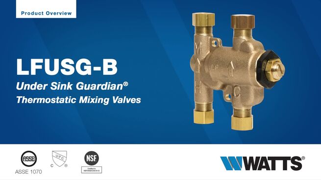 Series LFUSG-B Lead Free* Under Sink Guardian Thermostatic Mixing Valves are used in commercial and residential under-the-sink installations to maintain hot water at a desired temperature to avoid the risk of accidental scalding. It uses a thermostat to control hot and cold water temperature, and dual check valves protect against cross flow of hot water to cold and cold water to hot water piping. An integral strainer with 40 mesh screen filters out debris. Superior flow characteristics provide accurate temperature control with low pressure drop. Available with compression and push to connect fittings.