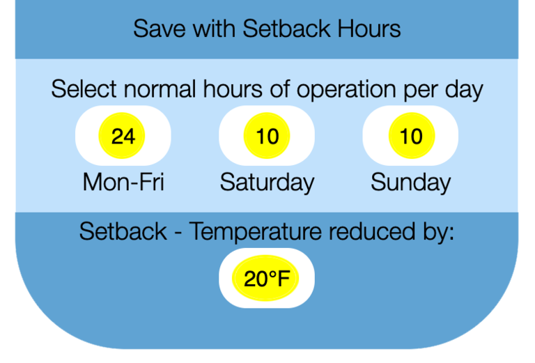 Setback = 120°F for 14 hrs on Saturday